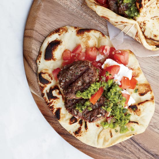 3. Meanwhile, in a food processor, combine the hot and mild chiles with the scallions, garlic and the remaining 1/4 cup of cilantro and pulse until chopped. Add the 1/4 cup of olive oil and process to a chunky puree. Season the harissa with salt. Wrap the lamb in the warm naan with tomatoes and feta. Spoon some of the green harissa on top and serve.