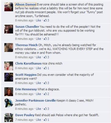 Disgusting behavior indeed. A United States Senator is mocking the wishes of a majority of Americans, celebrating the defeat of a bill 90% of us wanted. And some of these Americans used McConnell’s Facebook post to express their displeasure in the Republican’s taste.