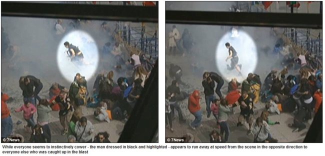 The next set of pictures show a man running away from the area where the bag was placed. Although it is possible that he was scared because of what had just occurred, it is a bit strange that while everyone around him seemed shocked, covering their ears and bending down, this man is seen running away in the opposite direction.
