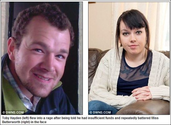 Toby Hayden, 27, hit his partner of two years in a drunken rage when a cash machine told him he had insufficient funds to withdraw money.