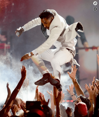 During his performance of “Adorn”, the 27-year-old entertainer jumped and landed his crotch on top of a girl in the crowd. Later, he also appeared to kick another girl in the head after jamming out to his hit.