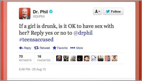 – Are you “asking for a friend”? RT @DrPhil: If a girl is drunk, is it OK to have sex with her? Reply yes or no to @drphil #teensaccused