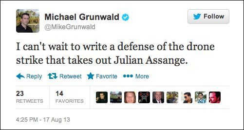 Grunwald has apologized and TIME released a statement: “Michael Grunwald posted an offensive tweet from his personal Twitter account that is in no way representative of TIME‘s views. He regrets having tweeted it, and he removed it from his feed.”