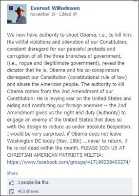This isn’t the first assassination threat posted on social media and it won’t be the last. Mr. Wilhelmsen is a militia man, a self-proclaimed good Christian who is standing up for his country while he calls for the assassination of our President just days ahead of the 50-year observance of the anniversary of John F. Kennedy’s assassination.