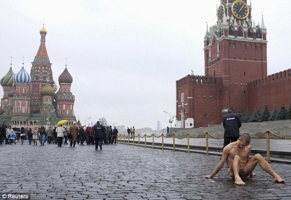 He was also arrested after wrapping his naked body in barbed wire outside a Saint Petersburg government building in May.