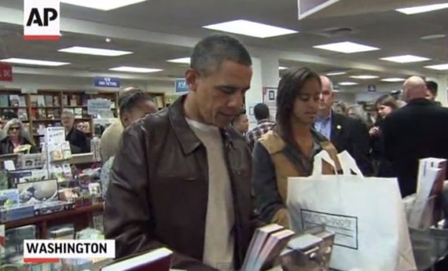 The big companies had their day on Black Friday so today, the day following the Black Friday extravaganza, is being observed as Small Business Saturday – supporting small local business. With that in mind, the President along with his two daughters Malia and Sasha took a trip down to the local book store – Washington’s Politics and Prose Bookstore – and… bought some books.