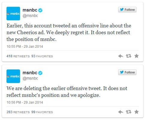 In 2013, Cheerios made a commercial using an interracial family. The blowback from the racists was unbelievable. The ad however, was a total success prompting Cheerios to release another. Referencing the second ad, someone on Wednesday used the official MSNBC Twitter handle and tweeted this;