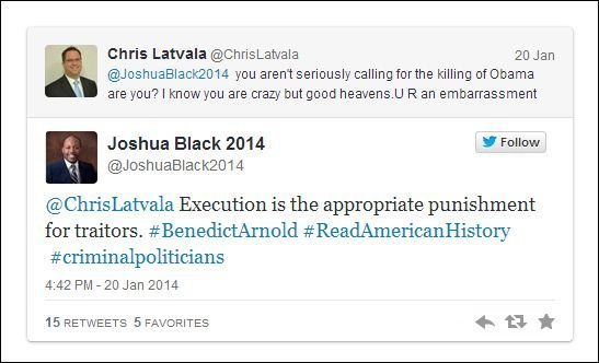 Joshua Black, a Republican candidate for Florida’s state House of Representatives, tweeted Monday that President Obama should be hanged for treason.