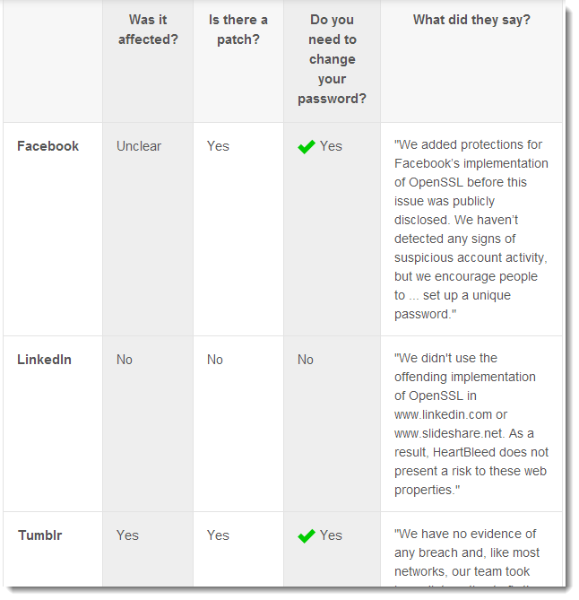 Below, we’ve rounded up the responses from some of the most popular social, email, banking and commerce sites on the web.Some Internet companies that were vulnerable to the bug have already updated their servers with a security patch to fix the issue.