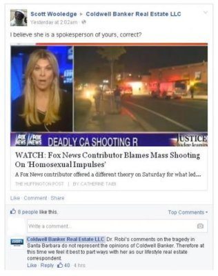 Coldwell replied with this: “Dr. Robi’s comments on the tragedy in Santa Barbara do not represent the opinions of Coldwell Banker. Therefore at this time we feel it best to part ways with her as our lifestyle real estate correspondent.”