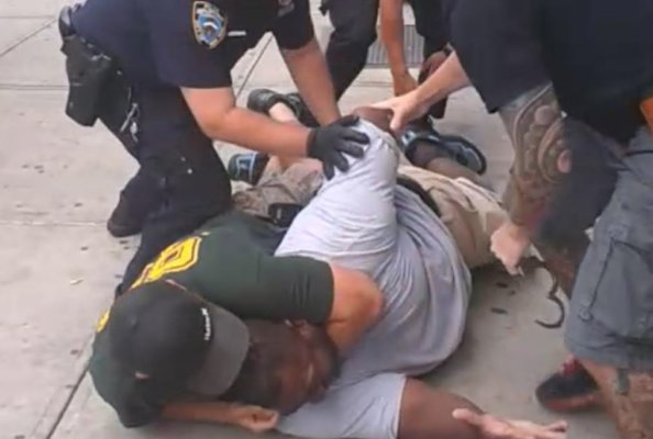 When Garner refused orders to put his hands behind his back, one of the plainclothes cops, wearing a green T-shirt with a yellow No. 99 on the back, got behind him and put him in a chokehold, the footage shows.