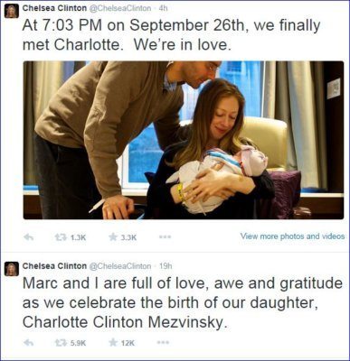 The tweet from the Chelsea Clinton says it all. The baby was born on Friday September 26th at 703PM, and needless to say, all the Clintons – the former President, the former Secretary of State and the former First Daughter – are all proud of their accomplishment. Oh, and so is the daddy Marc… he proud too! 🙂