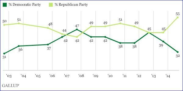 According to Gallup, 55% of Americans choose the GOP on this dimension, while 32% choose the Democratic Party. This is the widest Republican advantage in Gallup’s history of asking this question since 2002.