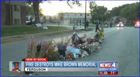 Police speculate candles are the cause of a fire that destroyed a Michael Brown memorial on Canfield Drive Tuesday morning, KMOV reports.