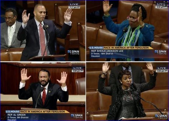Reps. Hakeem Jeffries (D-NY), Yvette Clarke (D-NY), Sheila Jackson Lee (D-Tex.) and Al Green (D-Tex.), referred to the gesture that has come to symbolize the outrage over the death of Brown, the African American teen shot dead by police officer Darren Wilson in August..