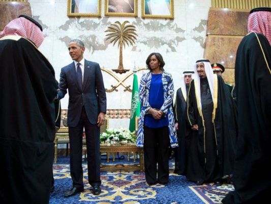 There she was, standing side-by-side with her husband as he stepped off Air Force One in Riyadh today, where, during a brief visit, the president offered condolences for the recent death of King Abdullah and met with his successor, King Salman.