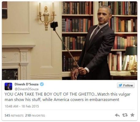 D’Souza posted this on his twitter feed apparently complaining that the President is a “vulgar man” and a “boy from the ghetto,” because the president took a selfie for Buzzfeed to promote the Affordable Health Care Act, better known as Obamacare.