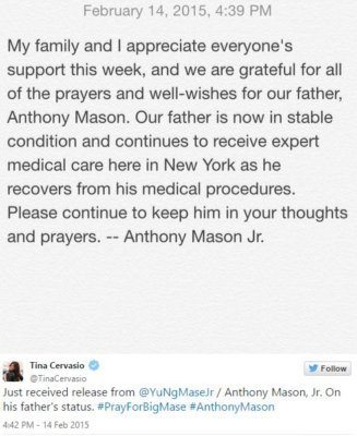 Sports broadcaster Tina Cervasio shared a typed statement from Mason’s son, who updated us on the state of his father’s health: