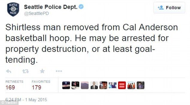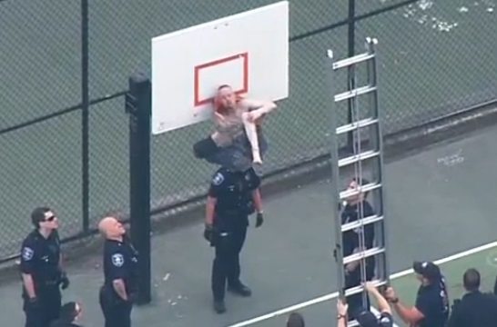 It took Seattle police several hours to get a man out of a basketball rim. According to reports, the man, wielding a hammer, is believed to have climbed into the net during Mayday celebrations on Friday.