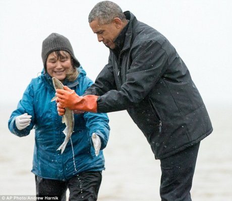Visiting an isolated fishing village on a grey, overcast day, the president was full of admiration for the whole operation: He pronounced salmon jerky “really good,” tried unsuccessfully to scare up a knife so he could attempt to filet a fish, and carefully inspected smokehouse drying racks.