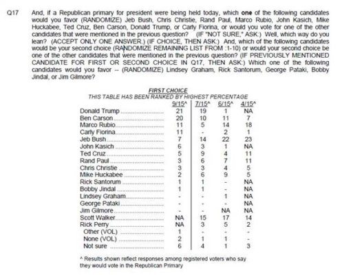 In the new poll, Donald Trump is now at 21% with Ben Carson closely following with 20%. Carly Fiorina and Marco Rubio are tied for third place with 11%. Coming in fourth is Jeb! Bush with 7%.