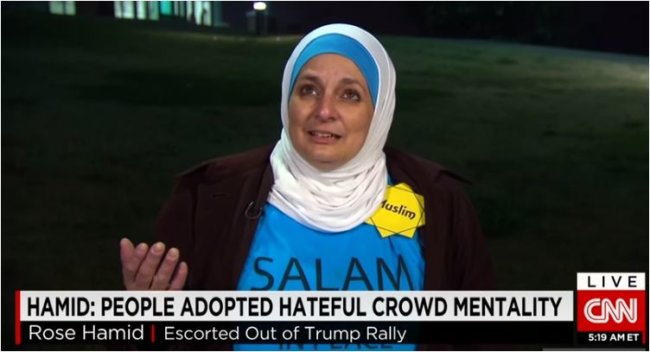 Rose Hamid, a 56-year-old flight attendant, told CNN that she went to the rally wearing a t-shirt that read “I come in peace” because she “figured that most Trump supporters probably never met a Muslim so I figured that I’d give them the opportunity to meet one.”
