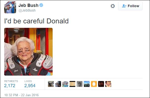 For his part, Jeb responded to Trump on Twitter tell him to “be careful,” and showing a picture of him mom dressed in football gear and wearing eye block painted across her cheeks.