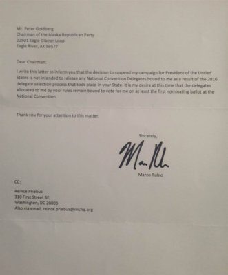 In a letter to the Chairman of the Alaska Republican Party, Marco Rubio told Peter Goldberg that he does not wish to release the delegates he earned while running for president, thus making sure that his delegates “vote for me on at least the first nominating ballot at the national convention.”