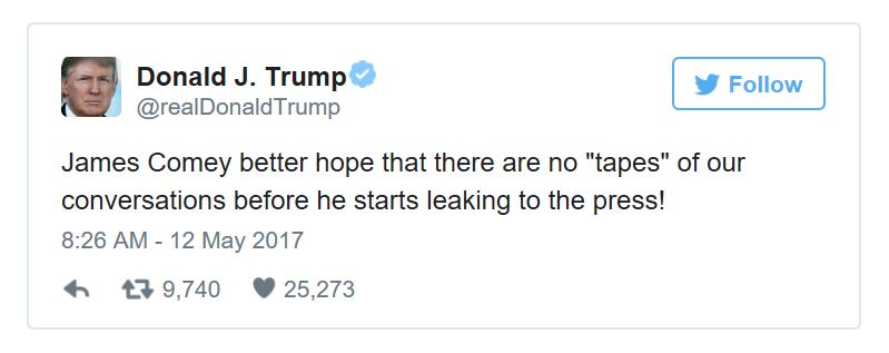 With that in mind, Trump took to Twitter to let Comey know exactly where he stands – “James Comey better hope that there are no “tapes” of our conversations before he starts leaking to the press!”