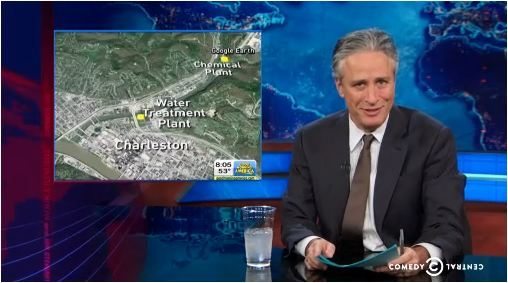 On his show Monday, Jon Stewart took on the toxic chemical spill in West Virginia and the unbelievable lack of security, and the even more unbelievable fact that a toxic chemical plant is located upstream of the drinking water. And if you think that is unbelievable, how about this… the toxic plant located upstream of a river used for human consumption was last inspected in 1991!