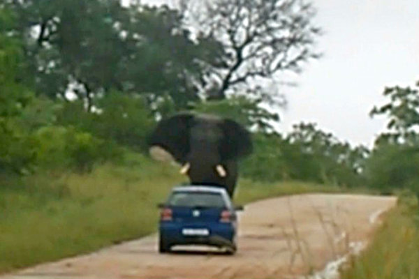 However the elephant spots the blue Volkswagon and quickly becomes infuriated.